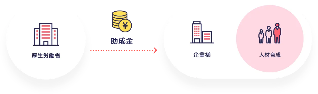 人材開発支援助成金は、企業様が雇用する労働者に対して、職務に関連した専門的な知識及び技能を習得させるための職業訓練等を計画に沿って実施した場合等に、訓練経費や訓練期間中の賃金の一部等を助成する制度です。